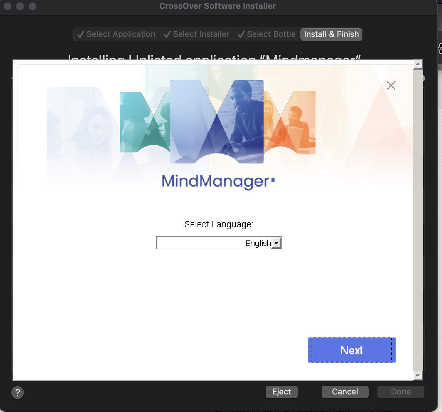 Cannot install Mindmanager 2022 on mac(crossover) i need it for formulas ii opens the installation window, but cannot press “next” when choosing language