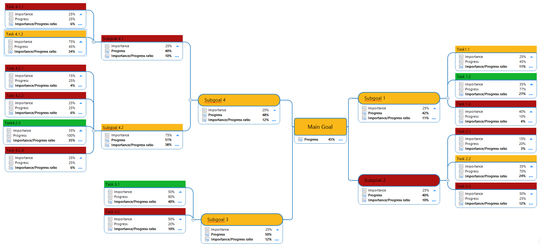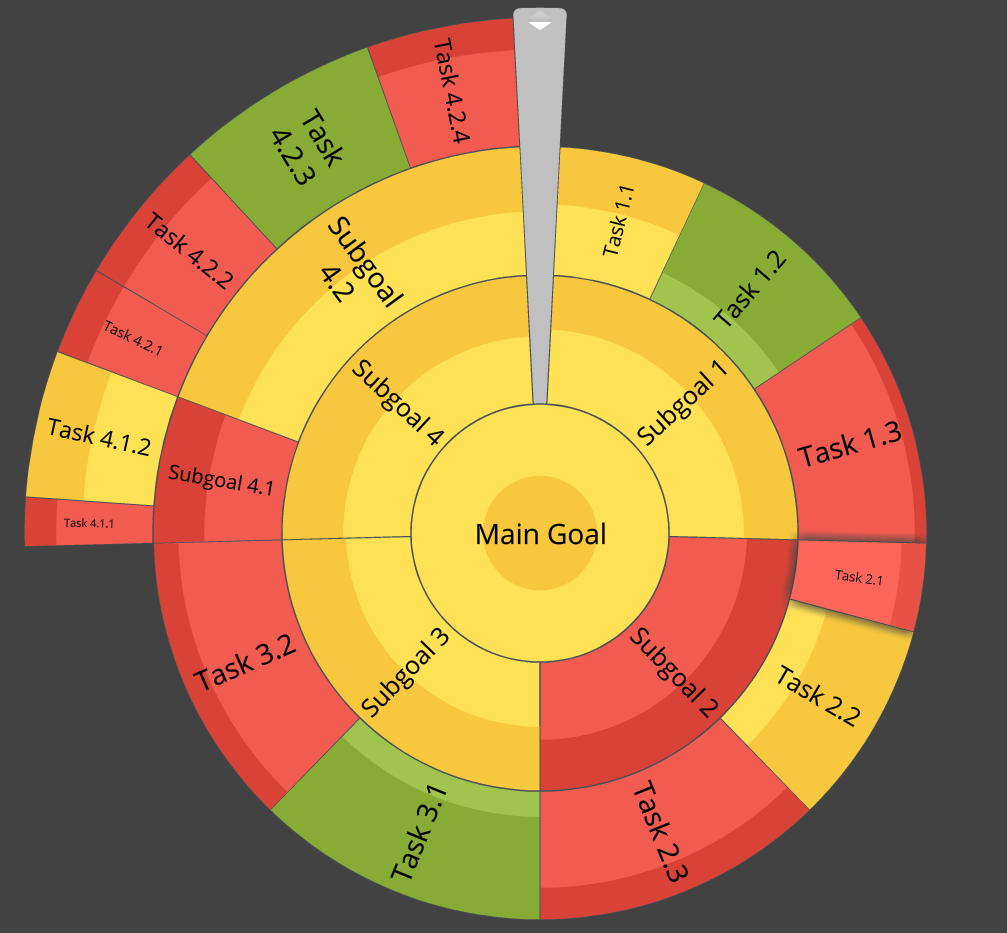 Goalscape maps are concentric goal maps on steroids. You can make segments (subgoals or tasks / key results) smaller or larger depending on their importance. In the outermost segments (= tasks or key results) you can record the progress, which is visually indicated by the shading of the segments. Along with the importance of each segment, this tracked progress automatically rolls up to the progress of the inner segments up to the main goal in the middle of the map, also visually represented by appropriate shadings. You can zoom into a segment at any time, giving you a new concentric map view of the subgoal. A minimap shows which part of the main map has been zoomed into.