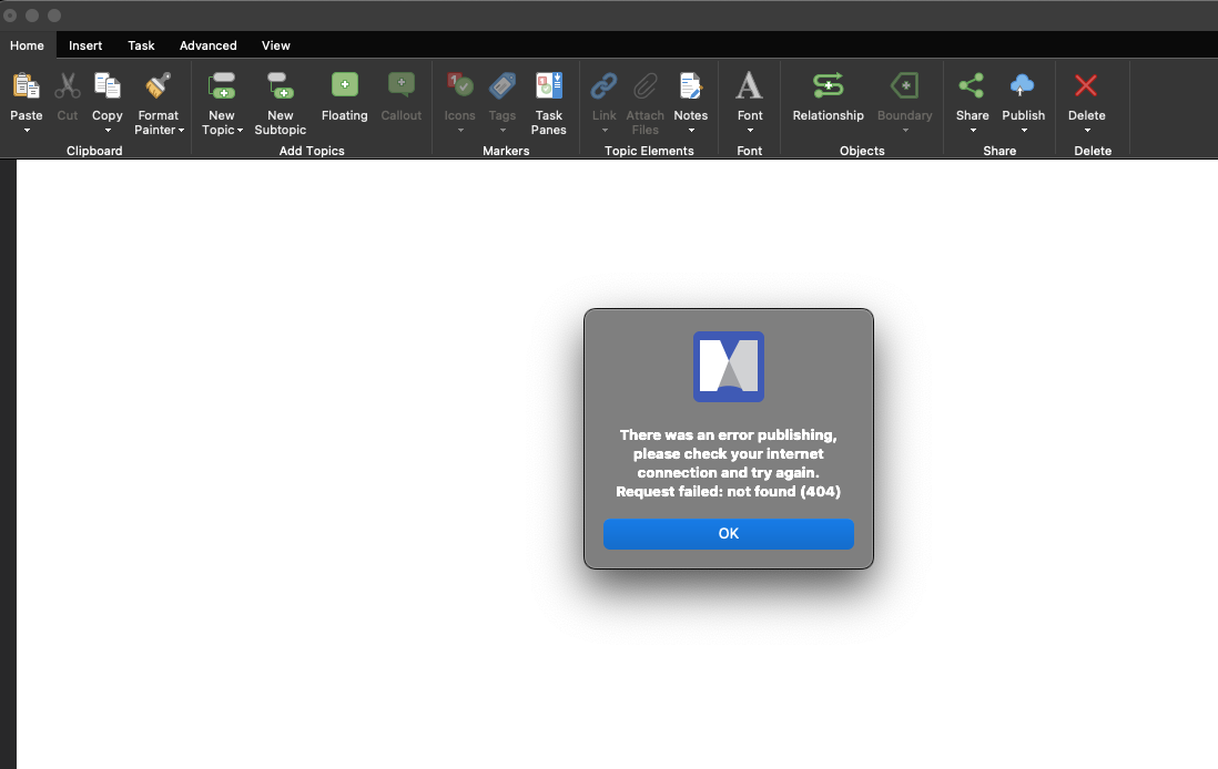 We cannot reproduce the issue with publishing when using MindManager for Mac 13.2.206. For next steps, please open a case with MindManager Technical Support here -