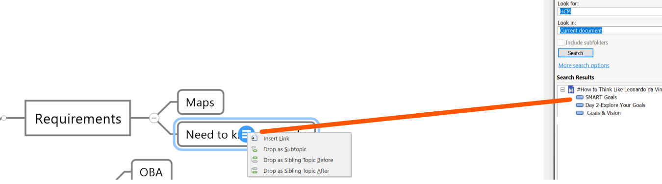 I have an open map and have completed a search. Is it possible to drag a search item topic or map onto the current open map. When I tried the above, it shows the link dialogue box, but the link does not show on the new map.