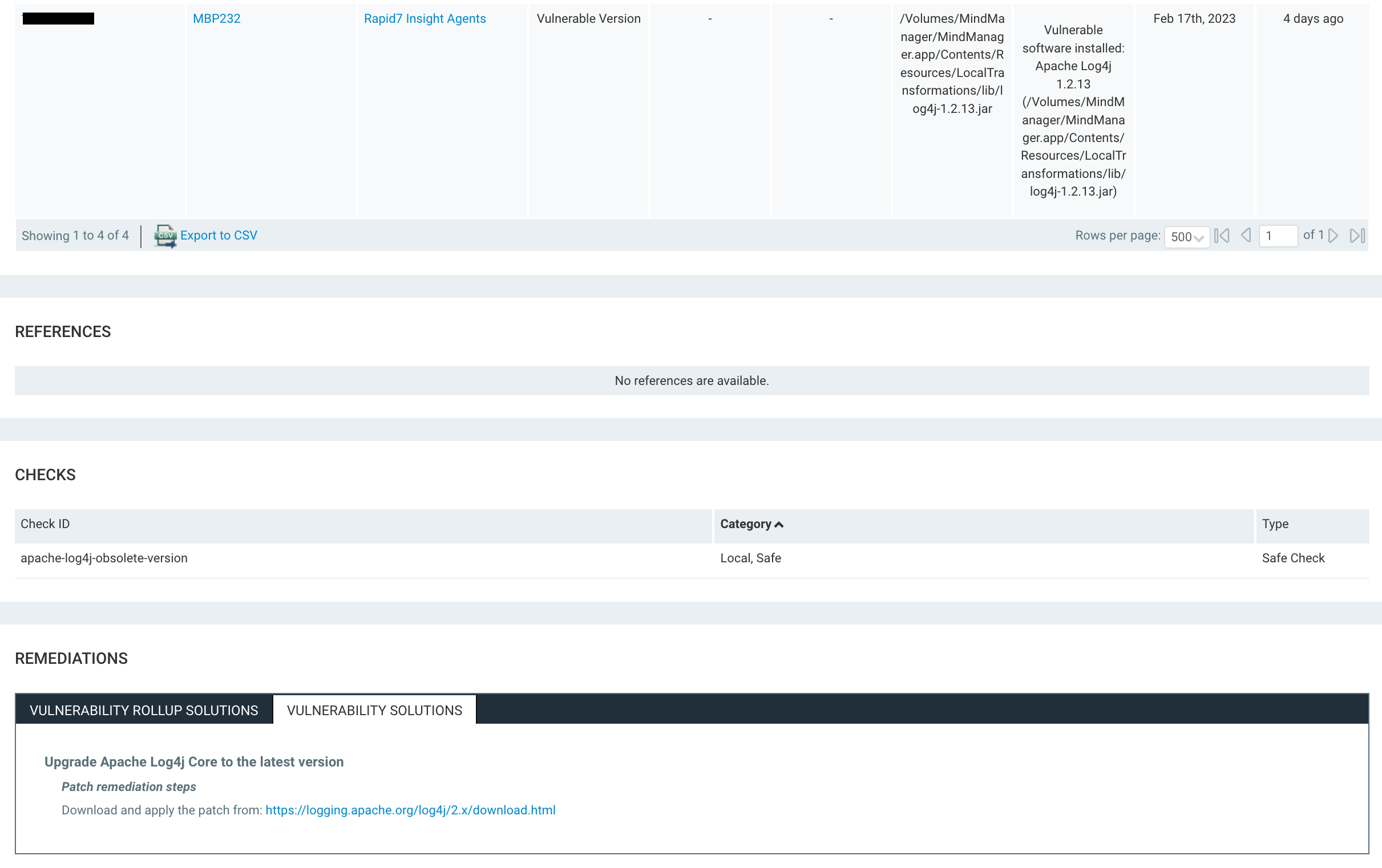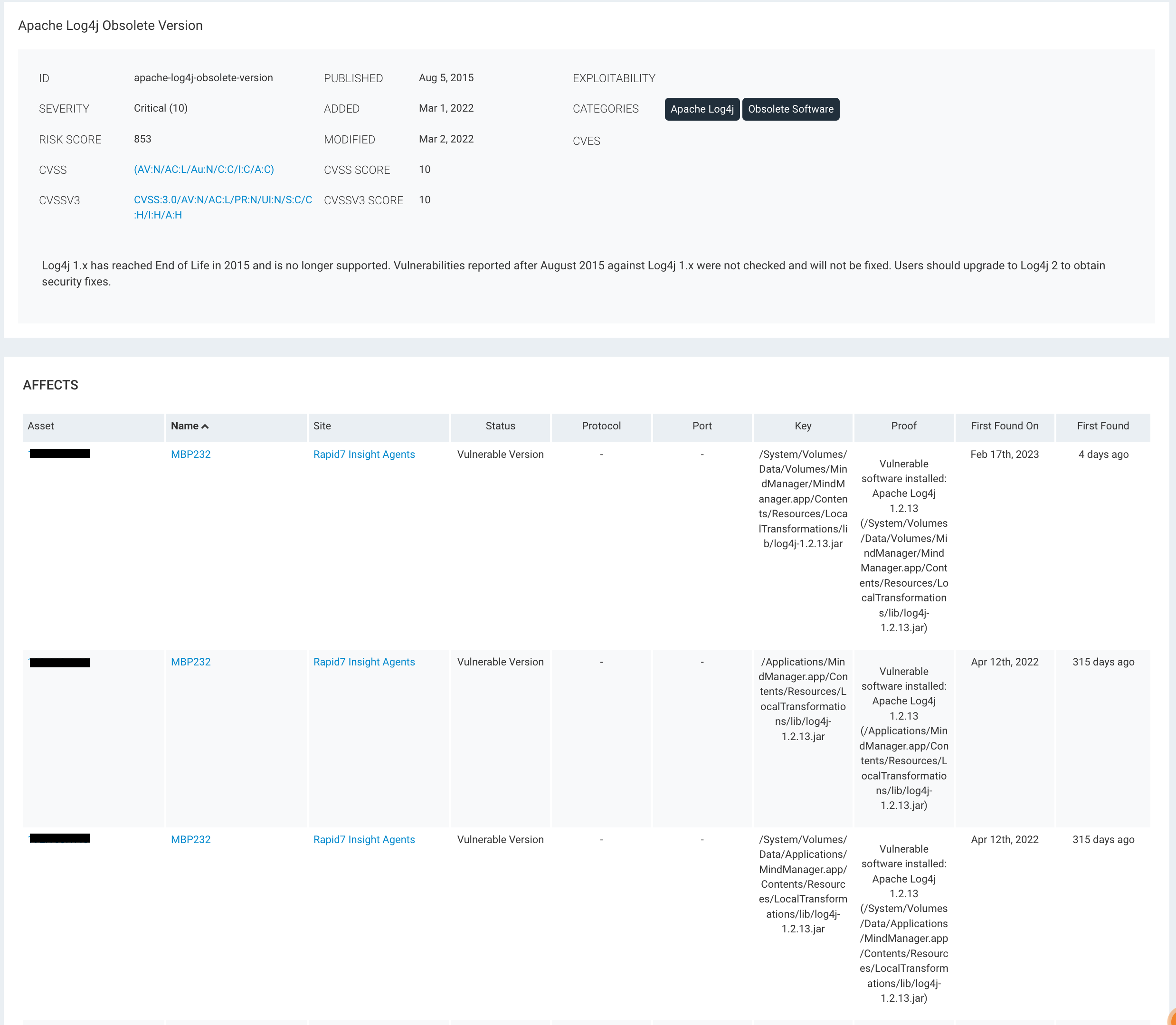 Vulnerable software installed: Apache Log4j 1.2.13 (/Volumes/MindManager/MindManager.app/Contents/Resources/LocalTransformations/lib/log4j-1.2.13.jar)