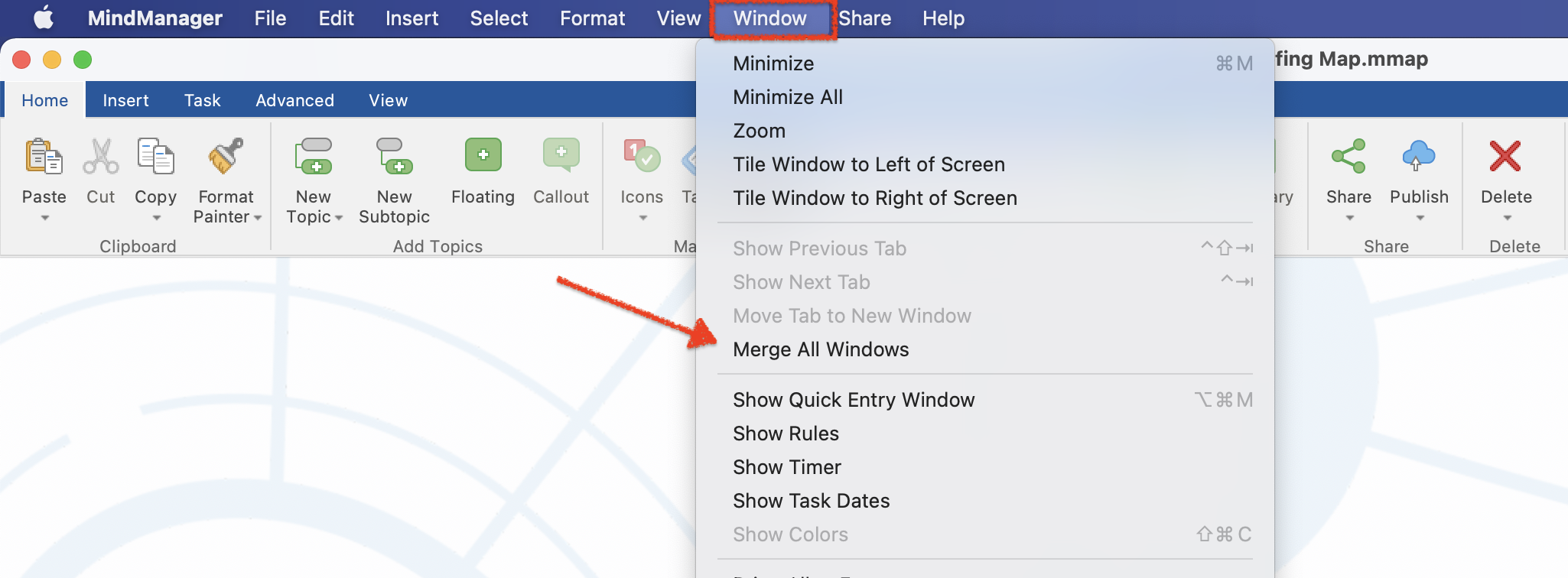 You can merge all open map windows by navigating to Windows from top menu > Click on Merge All Windows.