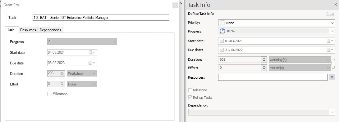 thanks a lot for your suggestion which I tried carefully. However the issue persists. The Rolled up Map data is correctly shown and calculated in the receiving map, that I double checked. Even so the same topic is shown in the Gantt Pro view in a different duration, progress data and due date.