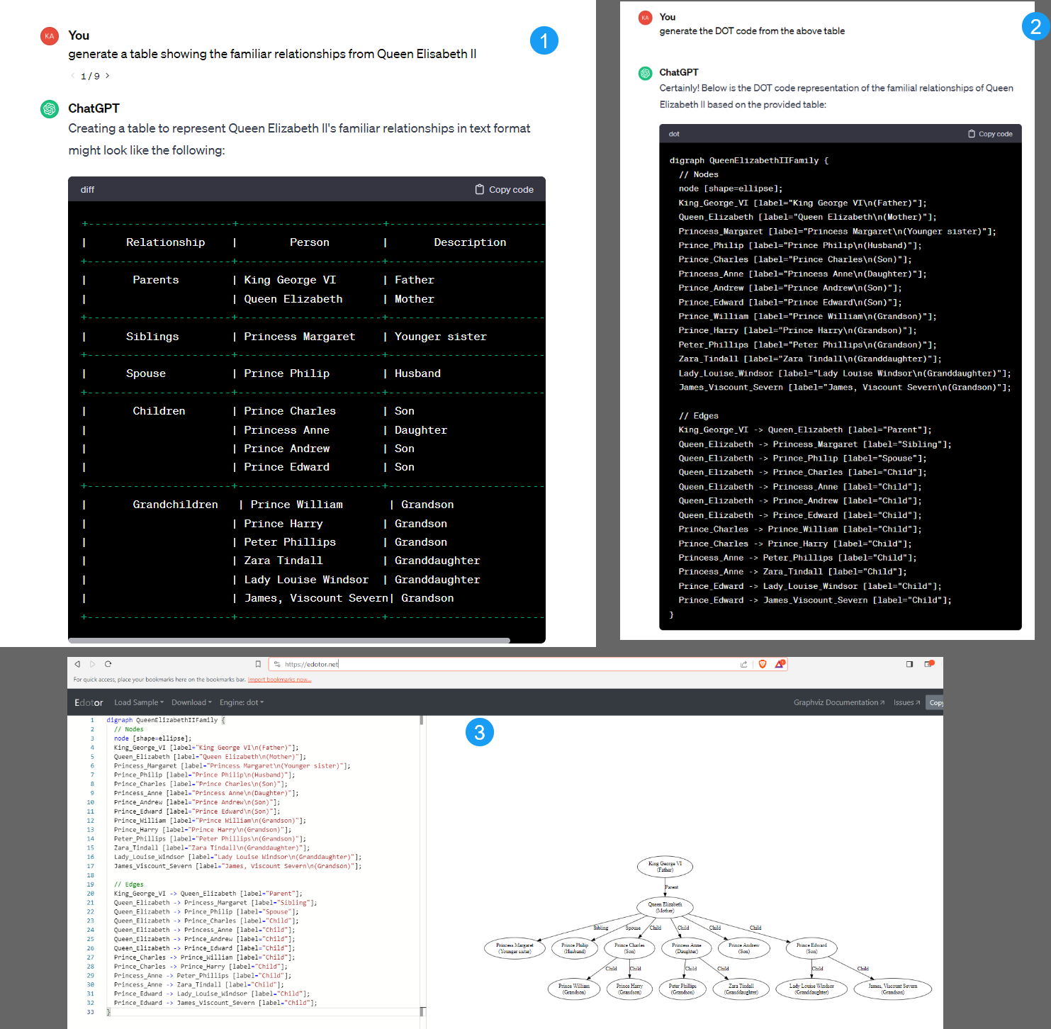 1. ask "generate a table showing the familiar relationships from Queen Elisabeth II"