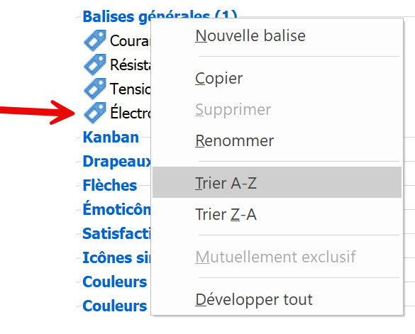 Il serait approprié que la fonction de classement alphabétique des Balises A-Z ou Z-A tienne compte des accents en français (voir l'exemple ci-joint). Les mots accentués sont relayés à la fin de la série.