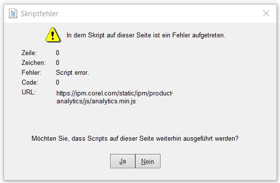 Starting MindManager 21 under Windows 10 leads - from one day to another - to a script error on the following page: https://ipm.corel.com/static/ipm/product-analytics/js/analytics.min.js