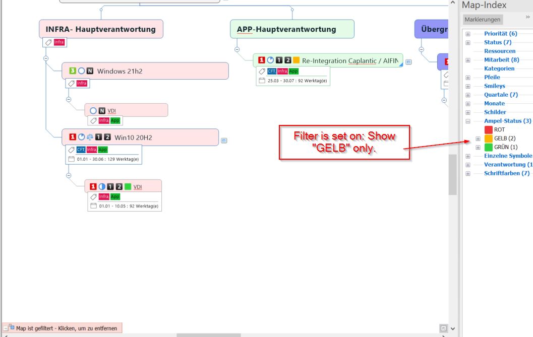 However: When I filter on "GELB" only, much more items are displayed to which "GELB" is not assigned. This happens with other filer-criteria as well. I can see no pattern by now. The Problem occurs in Mindmanager for Windows an persists in HTML5-Exports.