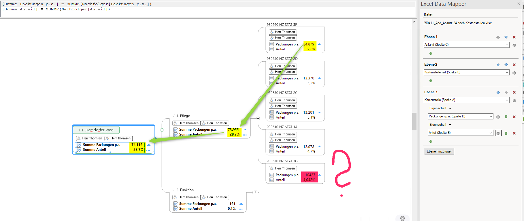Aktuell habe ich in Ebene 3 zwei berechnete Eigenschaften. Einen absoluten Wert, den ich gern mit einem 1.000er Trennzeichen ( 1.000 statt 1000) und einen relativen Wert, den ich mit einer Nachkommastelle und nicht wie aktuell mit drei darstellen möchte.