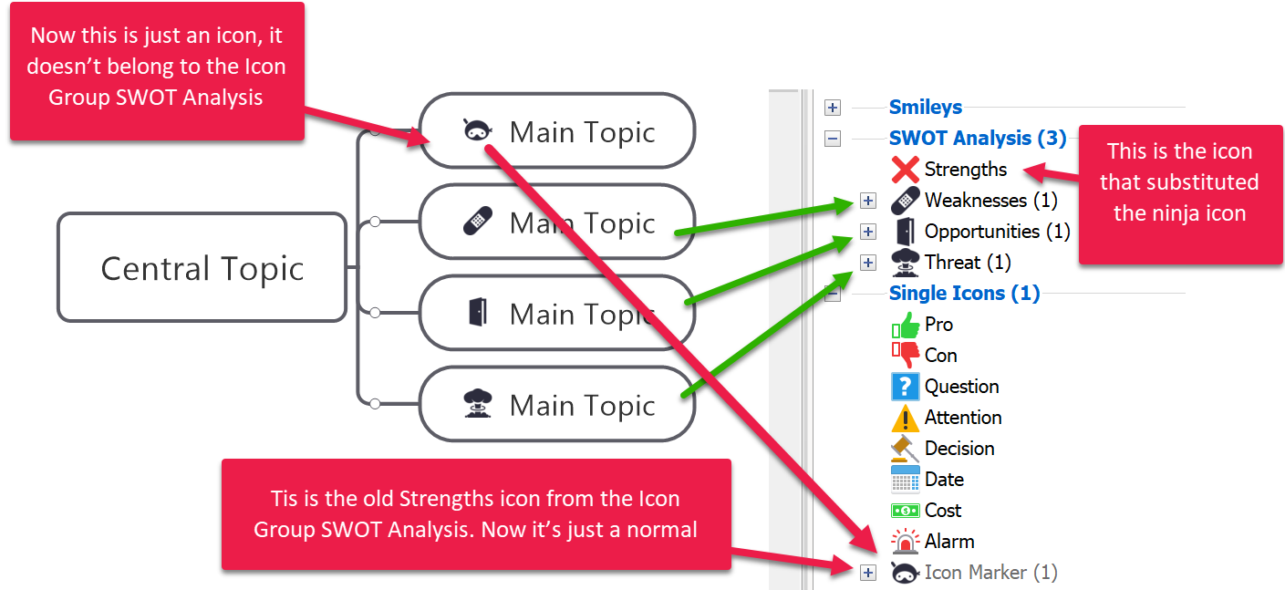 To change an icon that is already used, go to the Map Index task pane, right-click on the icon and click "Modify". You can then choose a different icon, and MindManager will change all the topics in the map where it is used. The old icon should not be orphaned as you show in Image02.