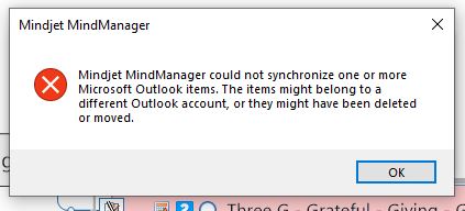 I can't get mindmanager (v18) to sync with my Outlook365 (windows10). It seems to want to point to an older non-exchange outlook account that I thought I had removed. I can't figure out how to 're-point' to the appropriate outlook exchange account. I can take an item from Outlook and it'll populate on a Map but it will not be able to sync. See attached message "Mindjet MindManager clould not synchronize one or more outlook items. The items might belong to a different Outlook account, or they might have been deleted or moved."