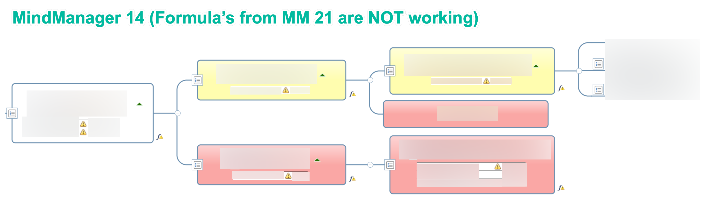 I'm seeing that when MindManager for Windows 21 or 22 files are opened in Mac MindManager 14, any Calculated formulas are not working (as defined in Topic Properties), and an error/exclamation mark shows. However, if I open the same MindManager files in Mac MindManager 13, the Calculated formulas are working correctly. So it appears that Calculated formula compatibility has become broken in MindManager 14?