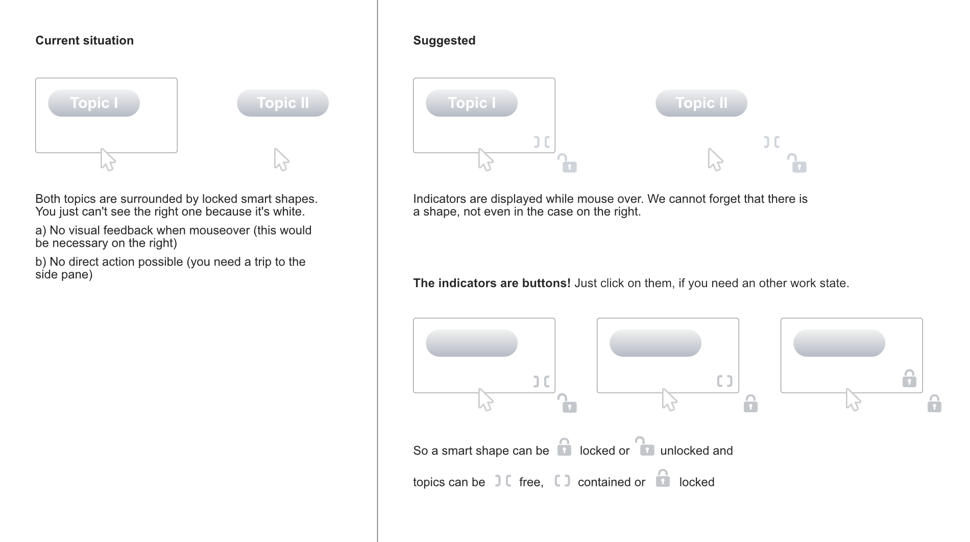 3. A smart shape can have three states now. We already know two of them: a shape is locked/unlocked and a container active or not. The third and new function is a hard lock for contained topics. This means, contained topics cannot be moved anymore. Shape and topics are one. (If it is allowed to change other things like topic color or shape, if they can be linked or not, these are things for the options panel)